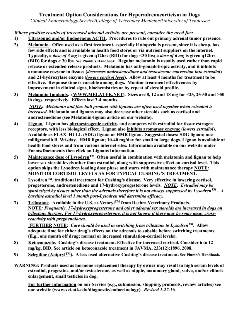There are some new non-drug treatments for Cushings Disease now and they were discovered through research by the University Of Tennessee's veterinary dept of endocrinology. They can be used alone or in conjunction with standard pharmeceutical treatments depending upon the outcome of the Cushings workup. Below please find this important information. Melatonin is a hormone and helps hair re-growth and changes other body chemicals, however, regardless of the protocol stating that it has few side effects, many dogs experience unsteadiness, drooling, falling over completely and sleeping heavily. This is why you must start with a very small dose or liquid Melatonin so it can be precicely dosed. Start with 0.5mg and work your way up if no side effects to 2 mg max. The article says 3mg 2x a day, but I don't feel that much is safe for a Boston from what I have heard.