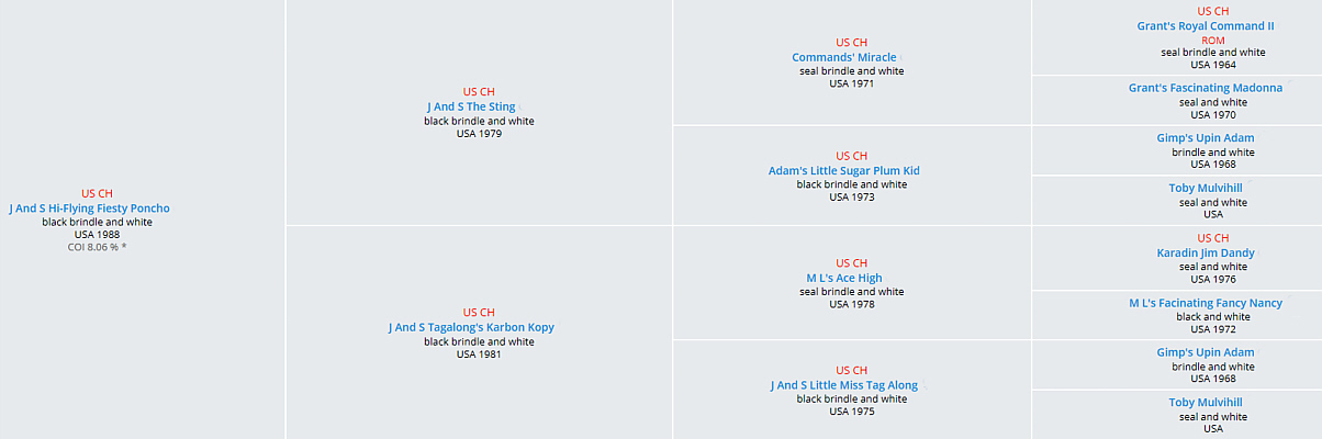 "Poncho" has the same pedigree as Ch. J And S Hot Flash R.O.M. He resulted from a repeat breeding.